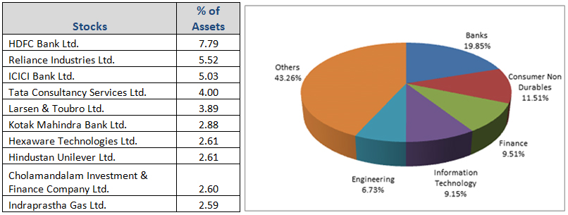 In terms of sector wise holdings, the fund has the maximum exposure to Banks at 19.9%. Consumer Non Durables and Finance follow with allocation of 11.5% and 9.5%, respectively. Infotech (9.2%) and Engineering (6.7%) too find place among the top preferred sectors. Pharmaceuticals, Petroleum Products, Auto Ancillaries, Oil & Gas and Cement are the other prominent sectors in the fund’s portfolio.