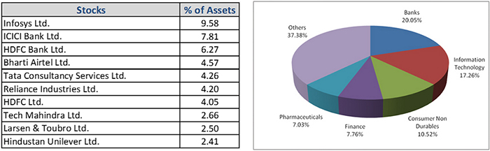 Classified under the Large-cap Funds category, UTI Mastershare Fund has the mandate to invest a minimum of 80% of its assets in equity and equity-related instruments of large-sized companies. Accordingly, the fund holds a predominant large-cap biased portfolio. It holds some allocation to mid and small-cap stocks as well. Aiming to avoid concentration risk, UTI Mastershare Fund invests in a diversified portfolio of 45-50 stocks spread across sectors in its portfolio. It takes a top-down view to determine sector weights and then uses a bottom-up approach for stock selection.