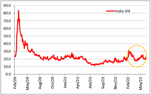 The India Volatility Index (India VIX), an indicator of market volatility, has been inching up since October 2021. It is a forward-looking indicator that highlights potential volatility in Nifty 50 over the next 30 days. A higher value indicates a higher expectation of volatility and vice-a-versa.